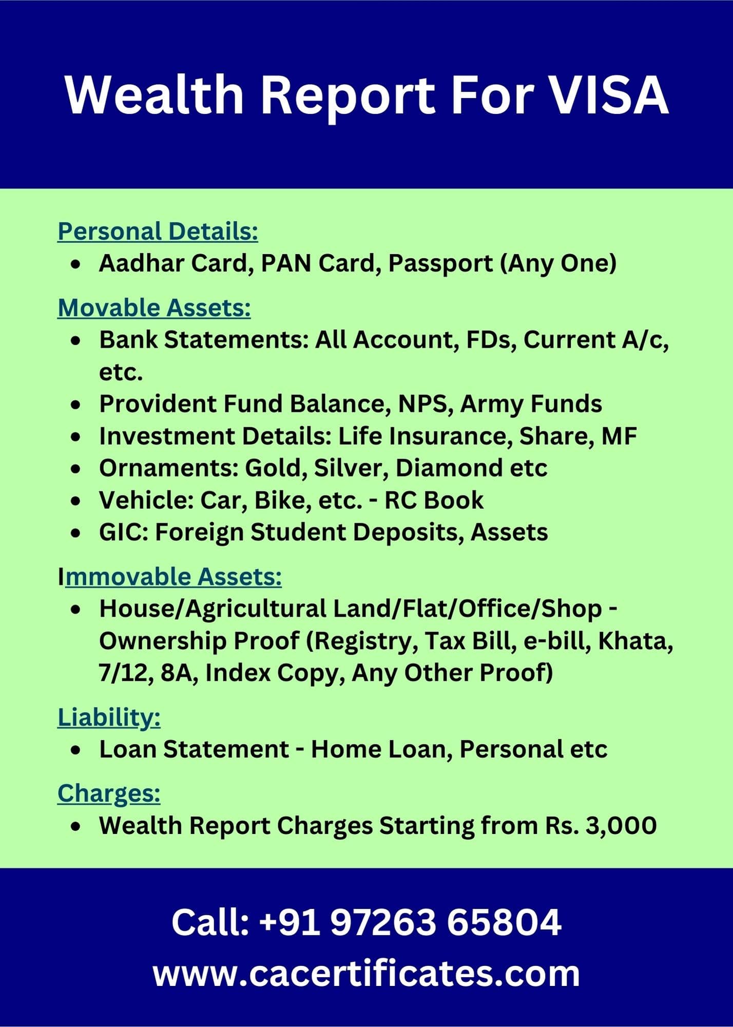 Are you looking for a CA Wealth Report for VISA Application? A Wealth Report for VISA Applications is a critical document that provides a detailed overview of an individual’s financial standing, including assets such as properties, investments, and liabilities. This report is required by consulates and immigration authorities to assess your financial stability and eligibility for certain visa categories, particularly investor and residency visas. Our team of experts prepares precise and compliant wealth reports tailored to meet the specific documentation requirements of embassies, ensuring a smooth and hassle-free visa application process across India. Let us help you present a clear and accurate picture of your financial health for your visa application.